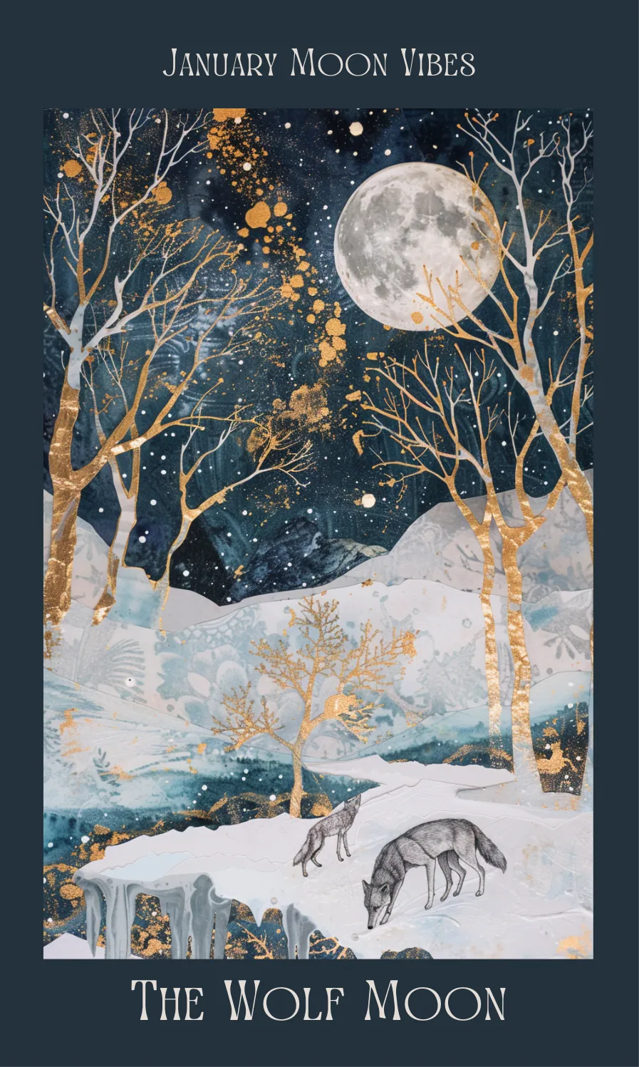 The Wolf Moon is the first full moon of the year, rising boldly in the crisp winter sky. This moon symbolizes strength, loyalty, and the courage to face new beginnings. As the howl of the Wolf Moon echoes through the stillness of January, it invites us to release the burdens of the past and step fearlessly into the promise of a new chapter.